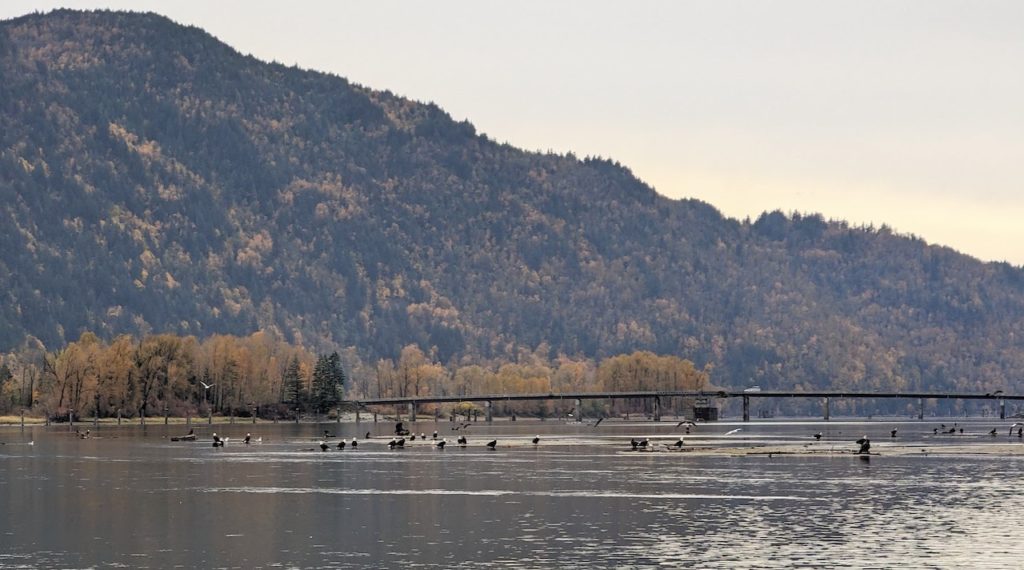 Sylvie noted that the eagles are a lot lower downstream than where they usually hang out. (We found them near the Highway 7 bridge.) We mused about what caused this shift. Are the salmons spawning and dying further downstream than they used to?