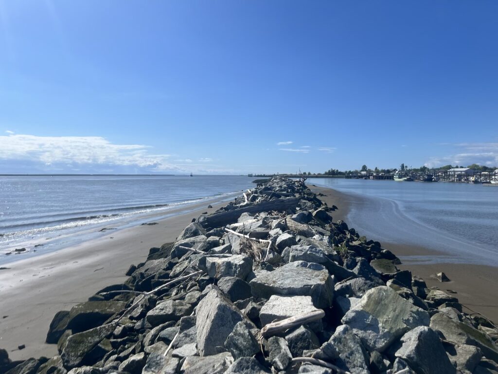 As I got closer to the western end of Shady Island, the sandy beach and trees turn into a man-made boulder dike. It was easy to stay close to the Island because of a southerly wind constantly pushing me towards the dike. It occurred to me that if there was a significant northerly wind that pushes me away from the Island and deeper onto Fraser, that could have been a problem.