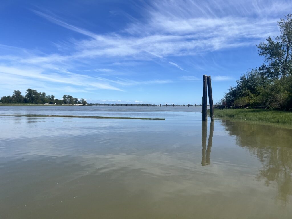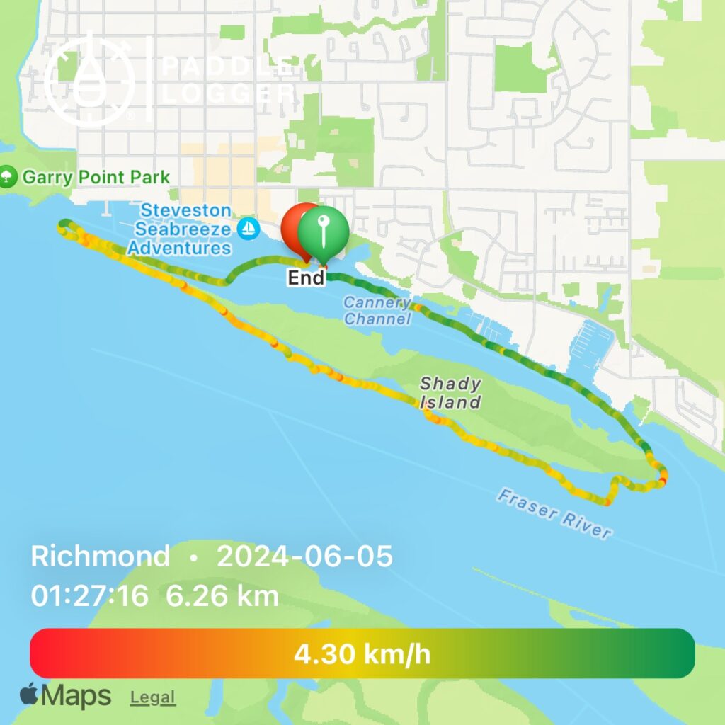I scouted the flow speed in the main Fraser River during one of my recent paddles by climbing onto the rocky western tail of Shady Island. The Fraser seemed to be flowing at a sleepy 2-3 km/h.