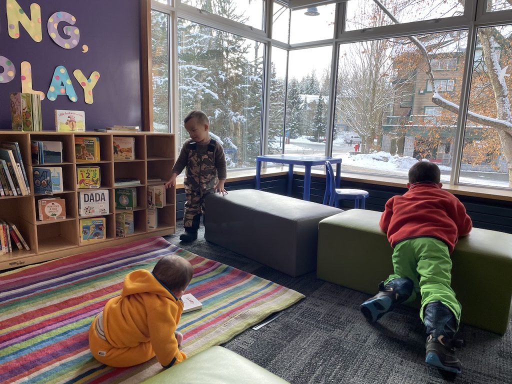 After saying goodbye to Middle Bro and Daddy at the Whistler mountain gondola base; Baby, Big Bro and I started heading for the Whistler Public Library where they have a family story time every Sunday morning.