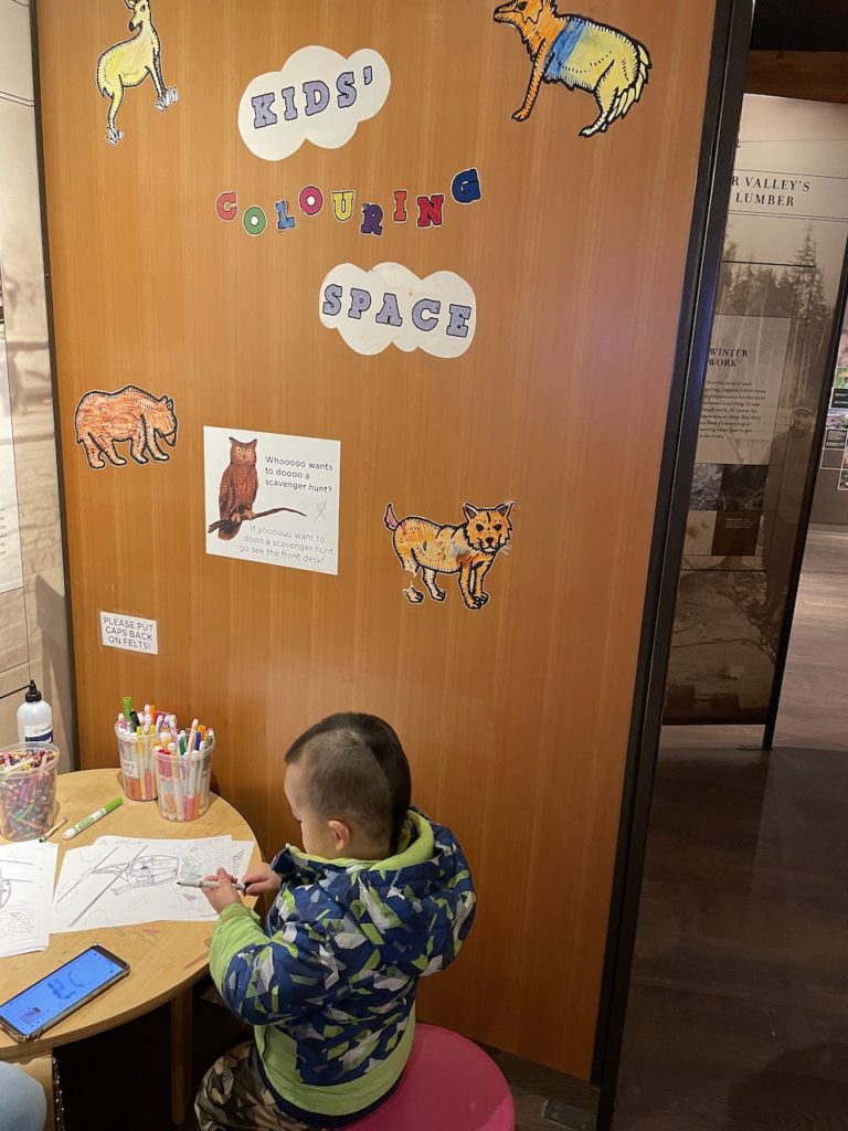 This little museum contains all of the rich history of Whistler and how it became a world class ski resort. There are several interactive stations, including a full size gondola, a rocks ID station, and animal identification. And for the kids, there’s a chest full of dress-up clothing! You can dress up as a construction site worker, skier, or even an Olympic torch bearer. Middle Bro wasn’t tall enough yet to put on the costumes but he sure did have some fun at the colouring station . With a suggested 5 dollar donation for admission, you can learn so much about Whistler here and it’s perfect to bring kids here.