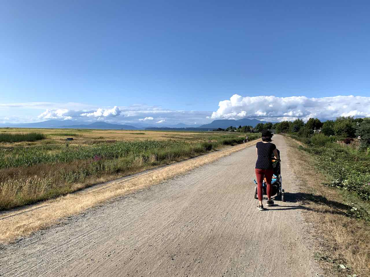 This is a wide and flat gravel trail from start to finish. If you start from Garry Point Park, it is 5.5 km long until you reach Terra Nova park at the other end. However, you don’t have to go end to end as there are many access points throughout. There are no shade on the dyke, which makes the whole trail very exposed and pretty hot when the sun is out in the summer. We couldn’t finish the whole trail as my toddler became tired biking and had to go home for dinner so we turned back at around the 2.5 K mark (took us about an hour to go this far). The trail is definitely stroller friendly and you can even use an umbrella stroller here.
