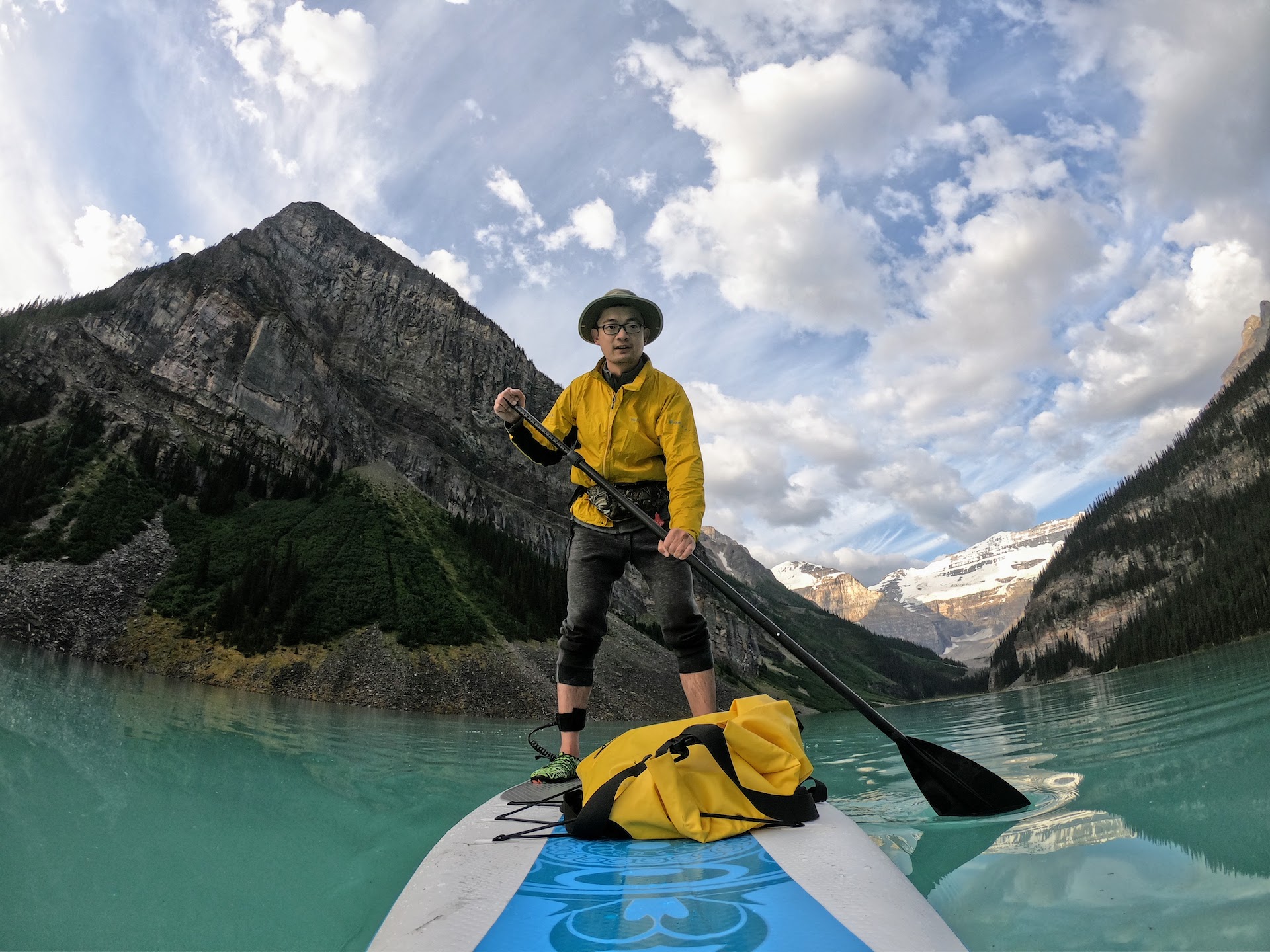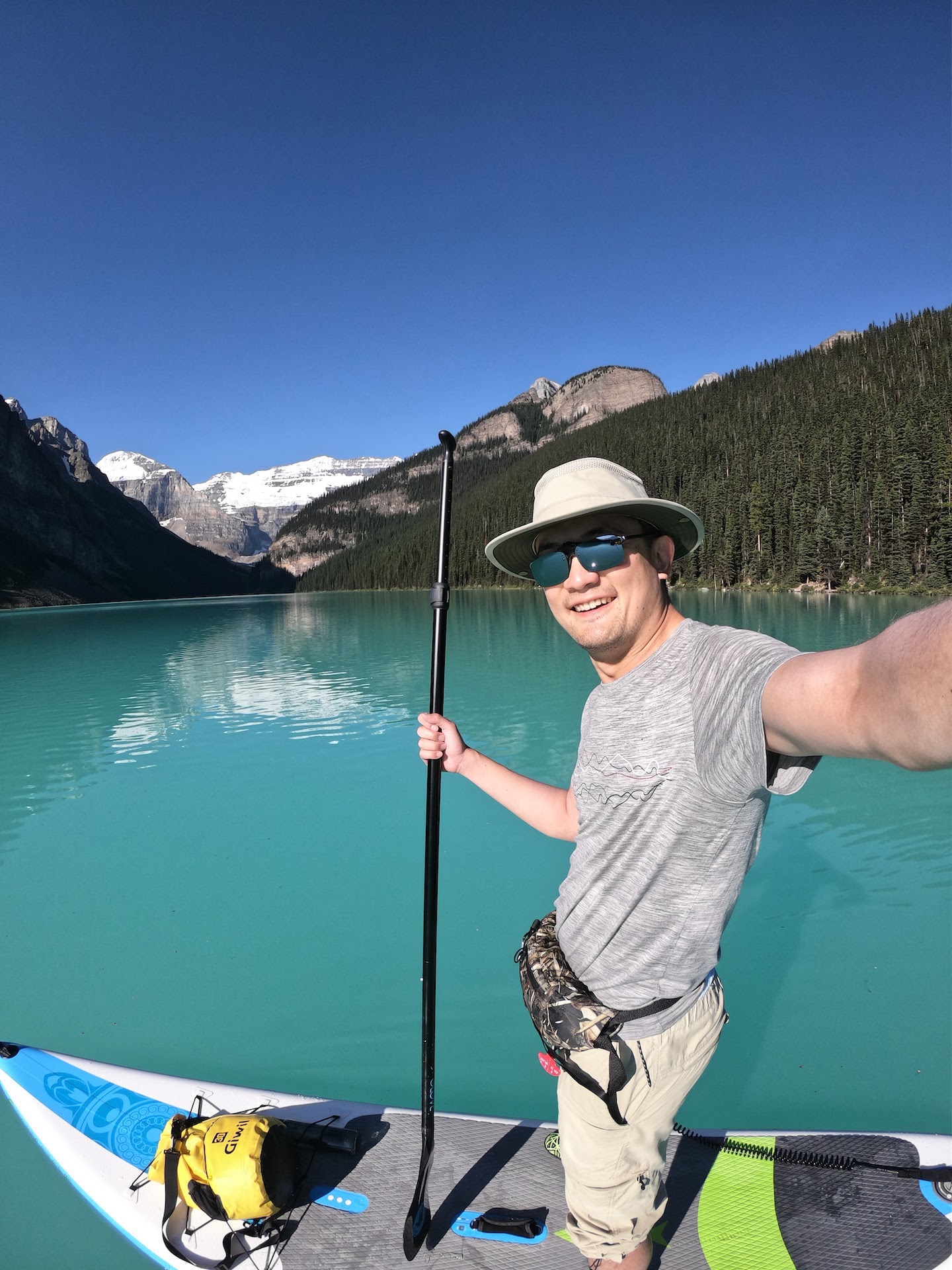 When we arrived at Lake Louise, the lake was as beautiful as I remembered. We splurged and booked a stay at the magnificent Fairmont Chateau Lake Louise. The bell service staff was beyond helpful, allowing me to store my pumped-up boards in their storage room for the duration of our stay.