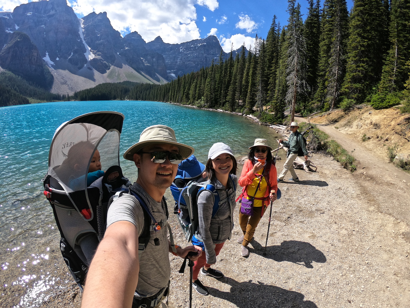 As discussed in my Moraine Lake Paddle post, parking here is insane. On the first morning of our stay in Banff, our original plan was to have my dad and I drive here at 6am to get our paddling in, and the rest of the gang will take a shuttle bus later at 11am after a leisurely breakfast. We got to the parking lot at 6:15am, and it was completely full. We didn’t know that we could park at the bus parking spots, so we turned back, defeated. Thankfully, we were able to get two more seats on the shuttle bus, so we still managed to get a quick hike in on the Moraine Lake Shoreline Trail.