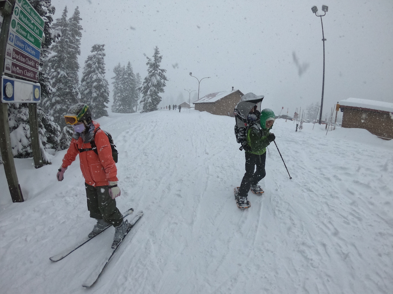 Given the enclosed tunnel of the Magic Carpet at Mt. Seymour, we are hoping to progress to open air chairlifts ASAP. Now that we’ve learned that both Tina and I can pilot Junior, advancing to chairlifts seems reasonable soon.