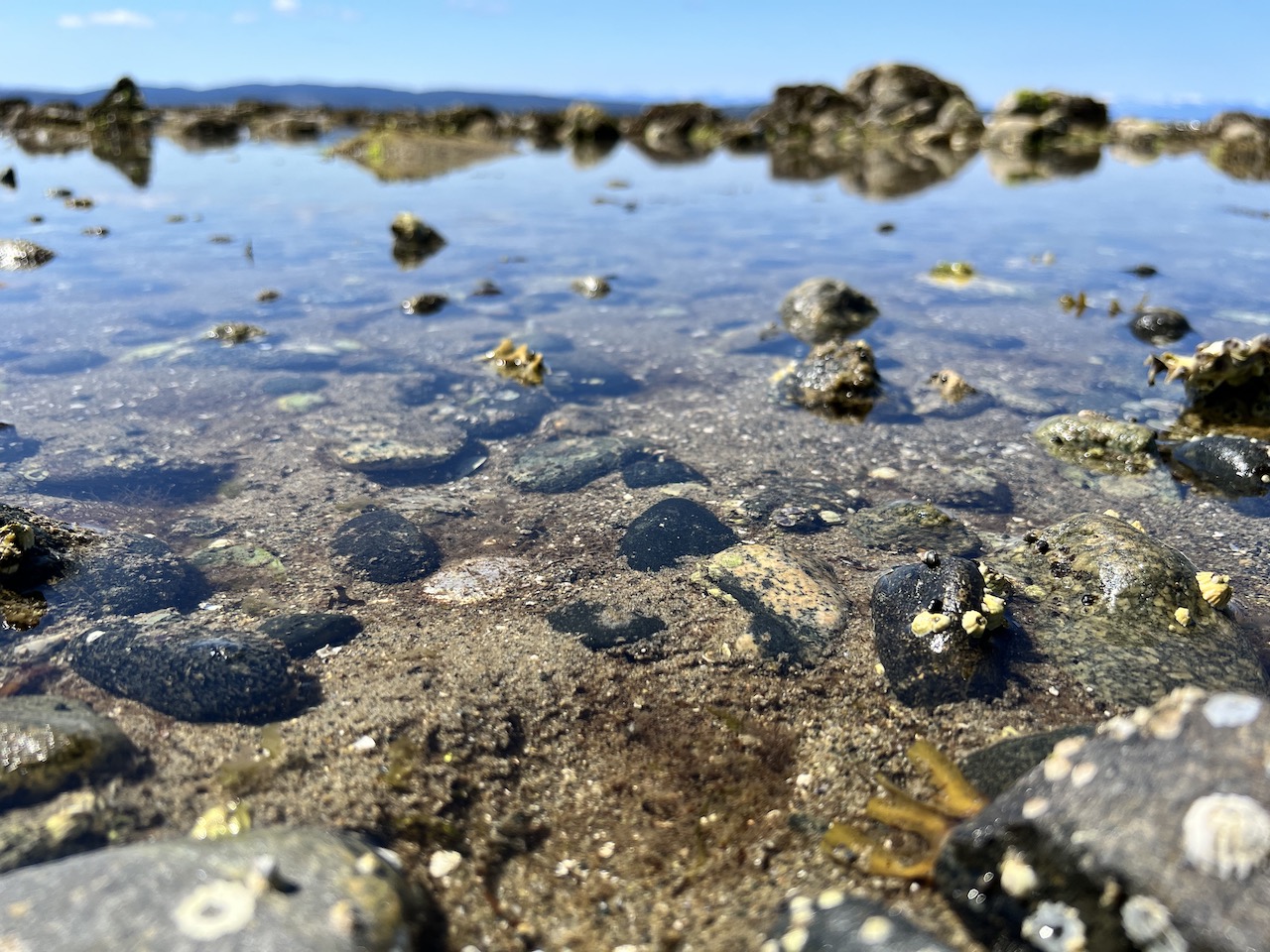 Pockets of water was trapped on the beach, creating small lagoons. Later I learned that these may be remnants of man-made structures built by the local Tla’amin People as fish traps.