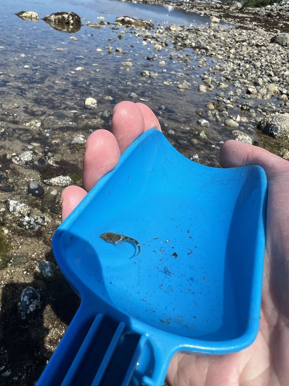We found lots of little fish in the shallow lagoon. We gently trapped one in Big Bro’s scoop for a closer look before putting him back.