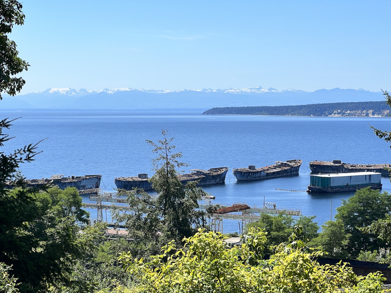 An arc of floating concrete ships form a breakwater for the active Powel River Pulp and Paper Mill. These ships were built around 1920’s to 1940’s, when steel plates were in short supply during the World Wars. After the wars, the ships proved to be too heavy and inefficient so they were decommissioned. Many of them were sunk as artificial reefs or breakwaters, but in Powell River the water was too deep to sink the ships as underwater breakwater, so they were kept chained up and floating.