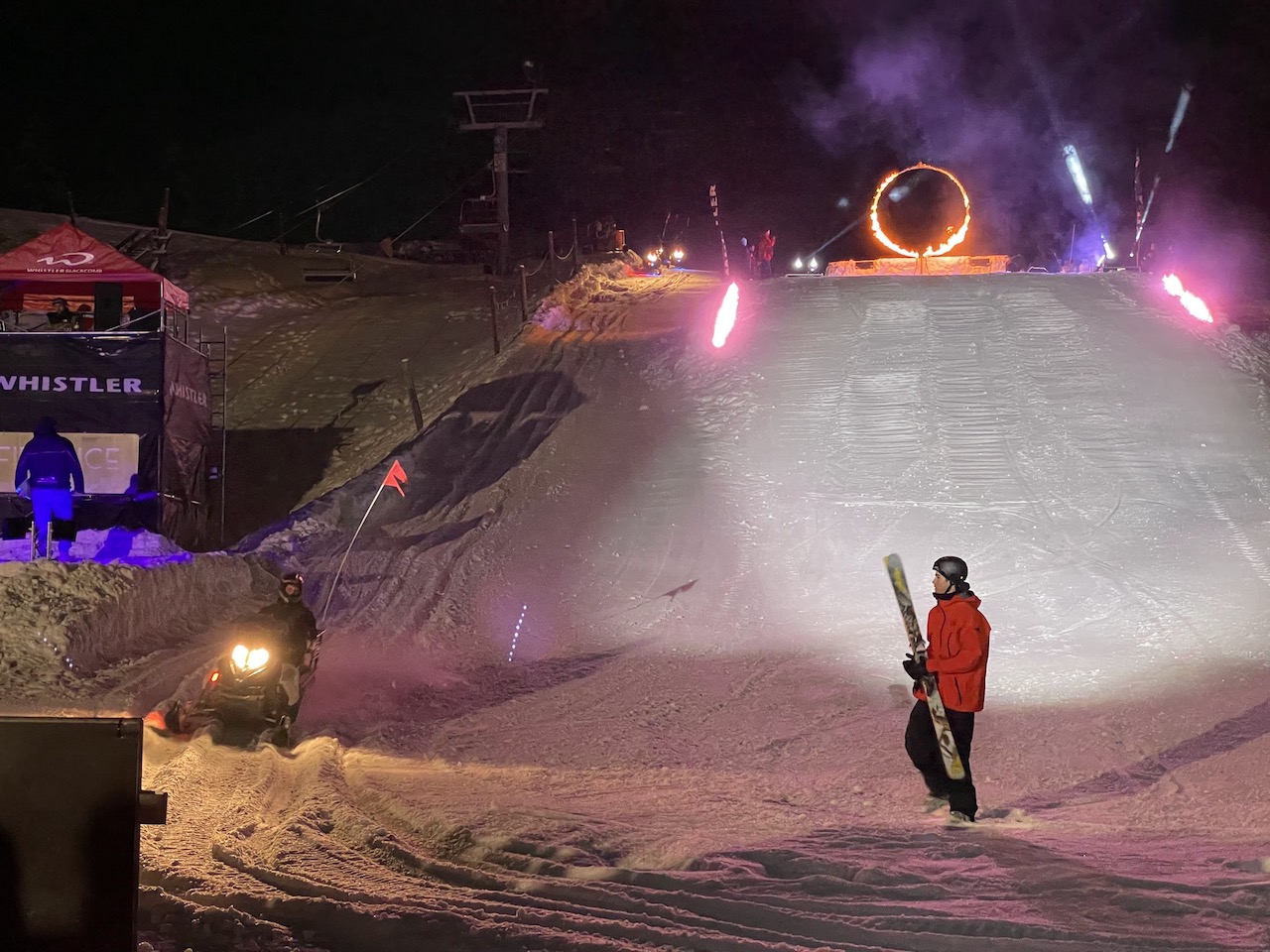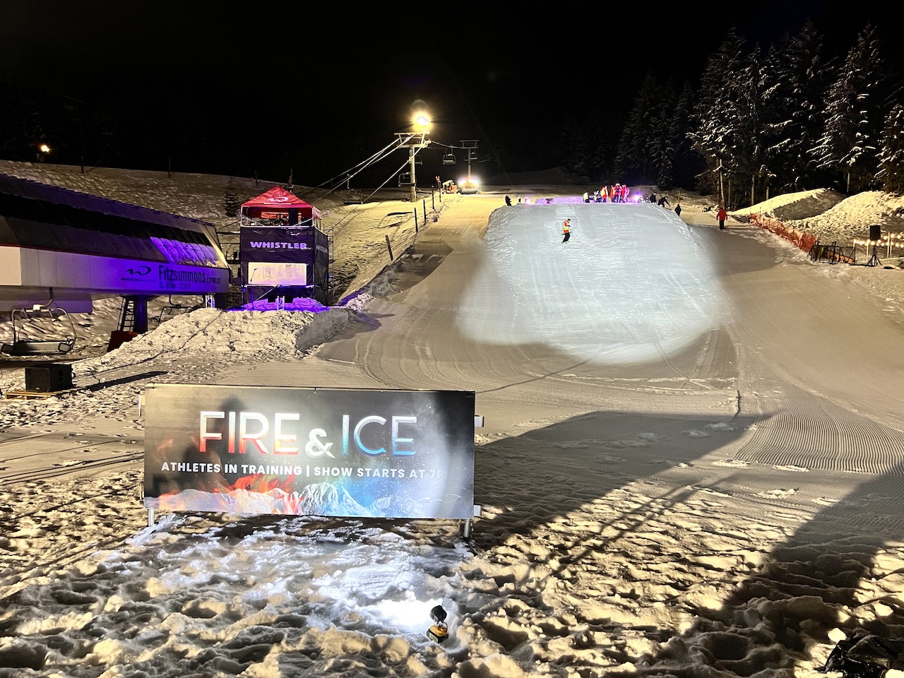 After dinner in the village, we grabbed some front-row spots at the Fire and Ice show and watched 10 amazing skiers and snowboarders jump through a ring of fire, followed by a brief fireworks show. This runs every Sunday night at 7pm, but we learned from the info booth attendants to arrive by 6:30pm to watch them warm up and beat the crowd.