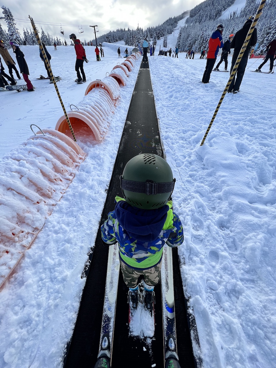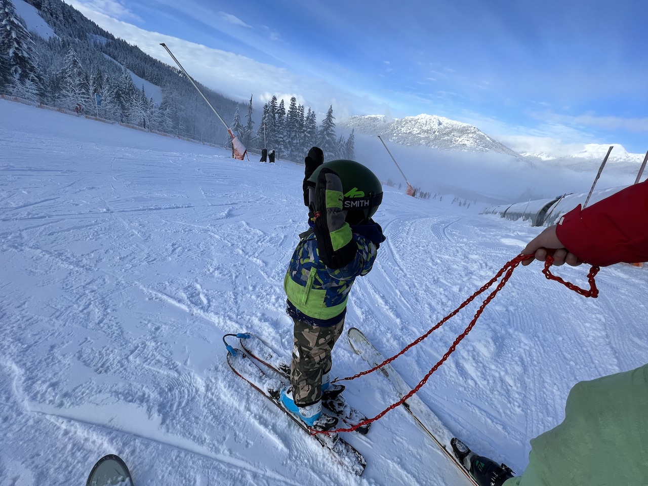 After a few runs on the magic carpet, I took out our old tether and ski clamps so I can start teaching Middle Bro pizza-ing.