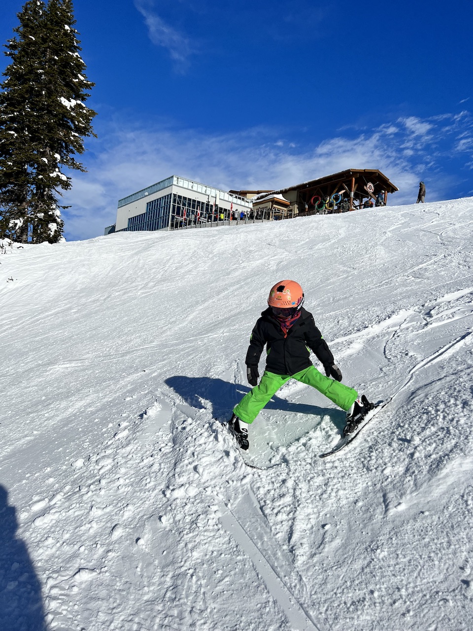 We came to the Olympic learning area again to warm up, and went all the way down to the village on the green Lower Olympic run. The runs outside the learning area were noticeably busier, but Big Bro had no trouble making his S turns without assistance. Even icier patches near the base were no challenge to him.