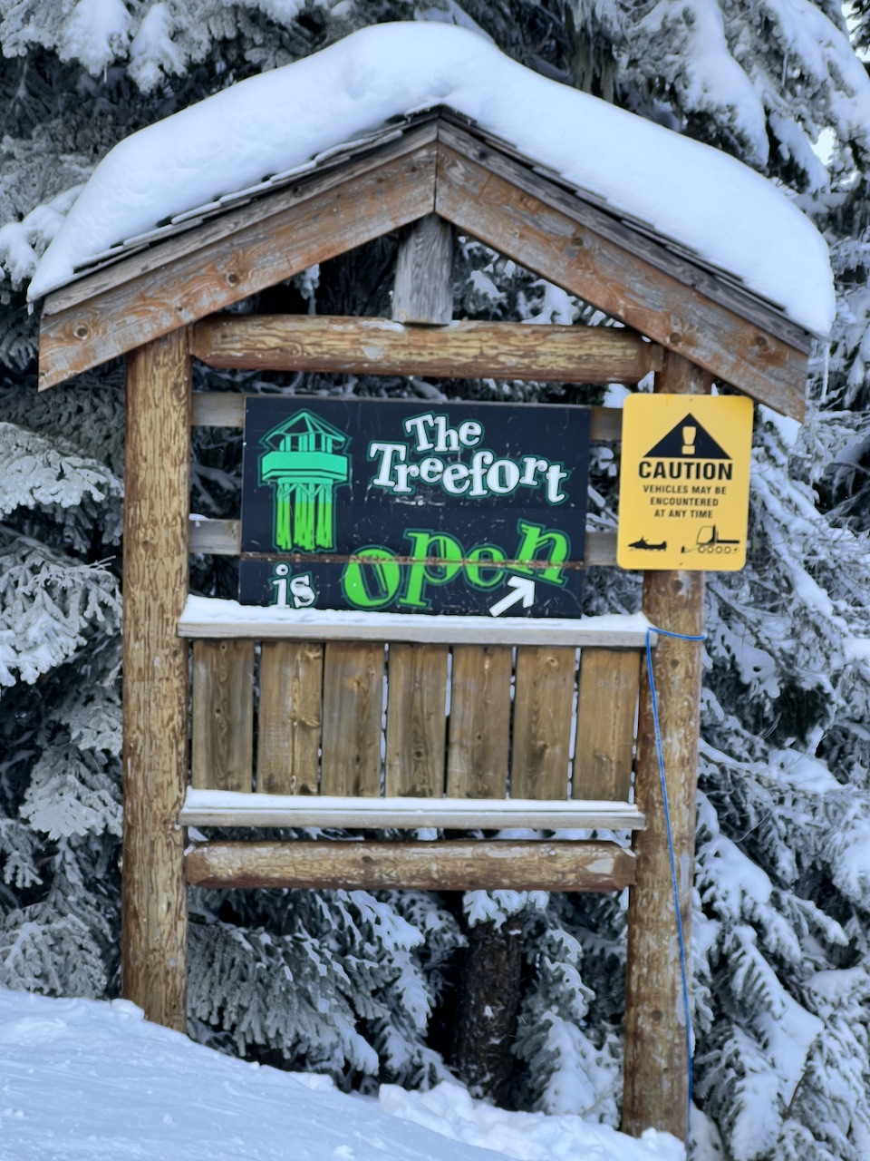 He did very well on this bluish-green section, but he was getting a bit tired. We found our way to the Tree Fort for another break. The Tree Fort is a cute little wooden structure with slides, tucked in the woods between Pony Trail and Bear Cub runs, accessible from either one.