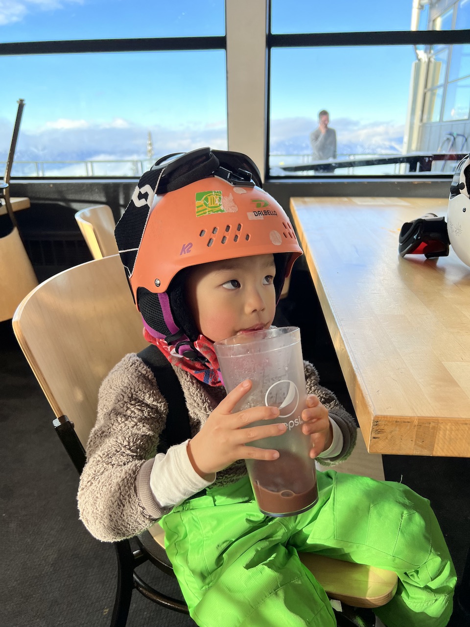 Even after a combined 40 min gondola ride, Big Bro was still pretty tired. So I whipped out my last secret weapon: pre-made hot chocolate in the Rendezvous building! It was highly effective. The lunch time crowds had already dissipated by the time we got there around 2:40, so we had no trouble finding a table.