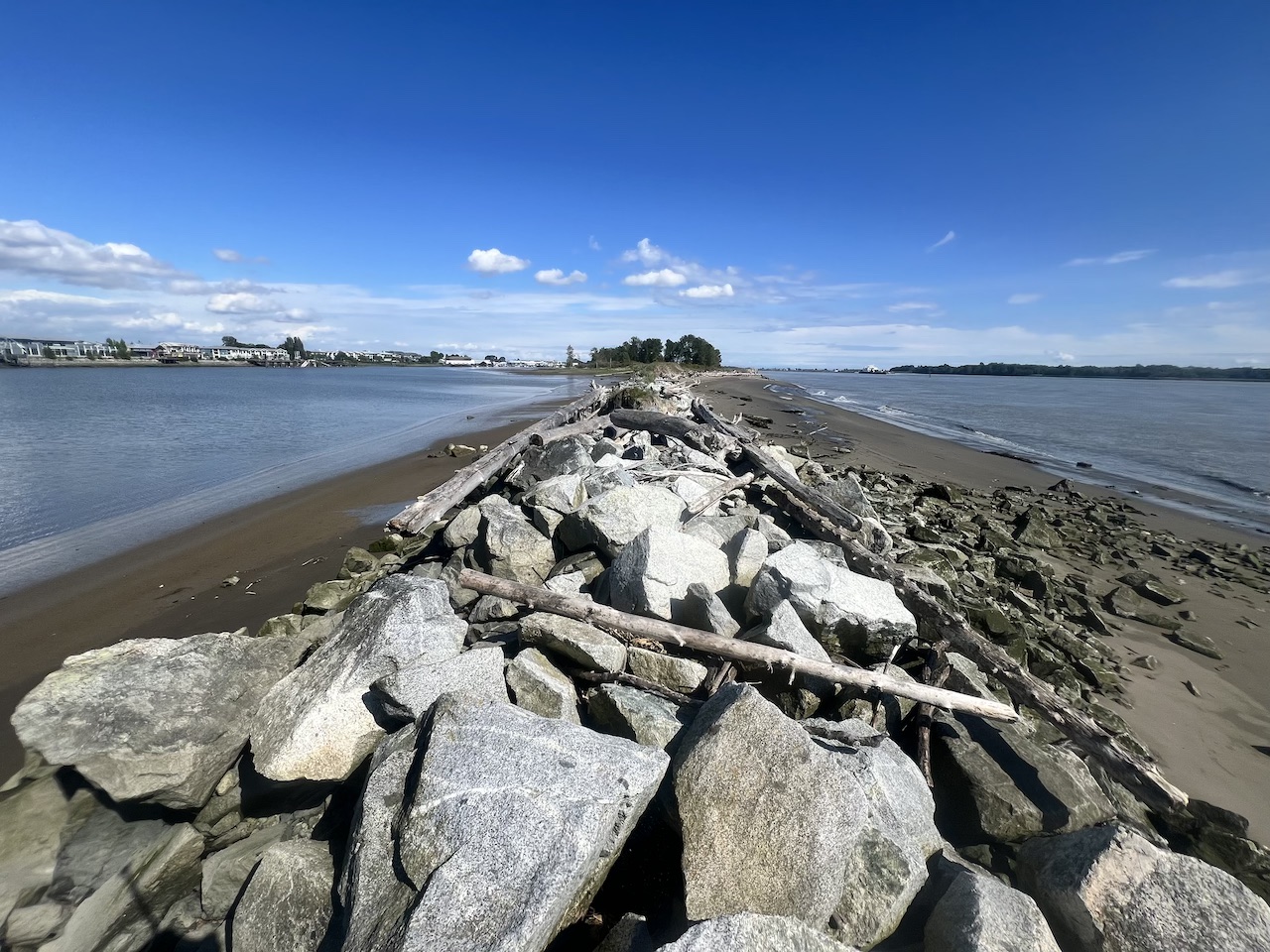 I scouted the flow speed in the main Fraser River during one of my recent paddles by climbing onto the rocky western tail of Shady Island. The Fraser seemed to be flowing at a sleepy 2-3 km/h.