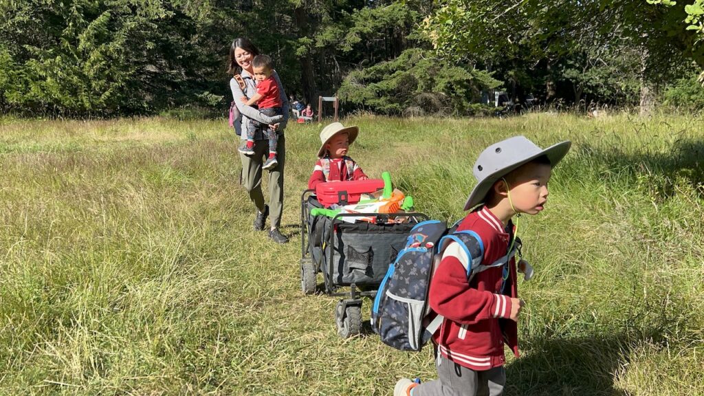 We carted our supplies down to our group site as last time. The main difference: with the benefit of having a reservation, we were much more relaxed. Also, Big Bro and Middle Bro were strong enough to help with pulling the wagon now. Group Site 3 is so big that we can easily find enough spots to set up 4 tents for 4 families down slope facing the ocean.