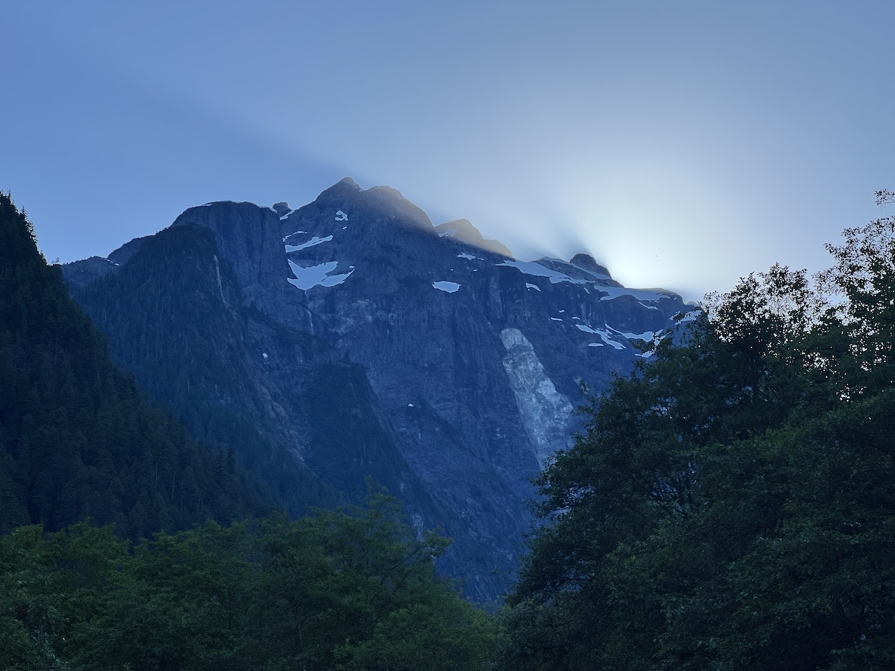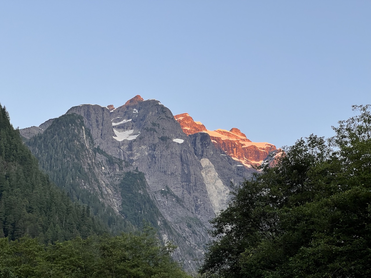 But we didn’t have 2-3 hours to enjoy this morning. The group soon got up as planned, and we efficiently finished breakfast and packed. The sun rose but was hidden behind the eastern mountains, so only the glaciers on Mt Robie Reid turned orange at first before the sun finally peeked through.