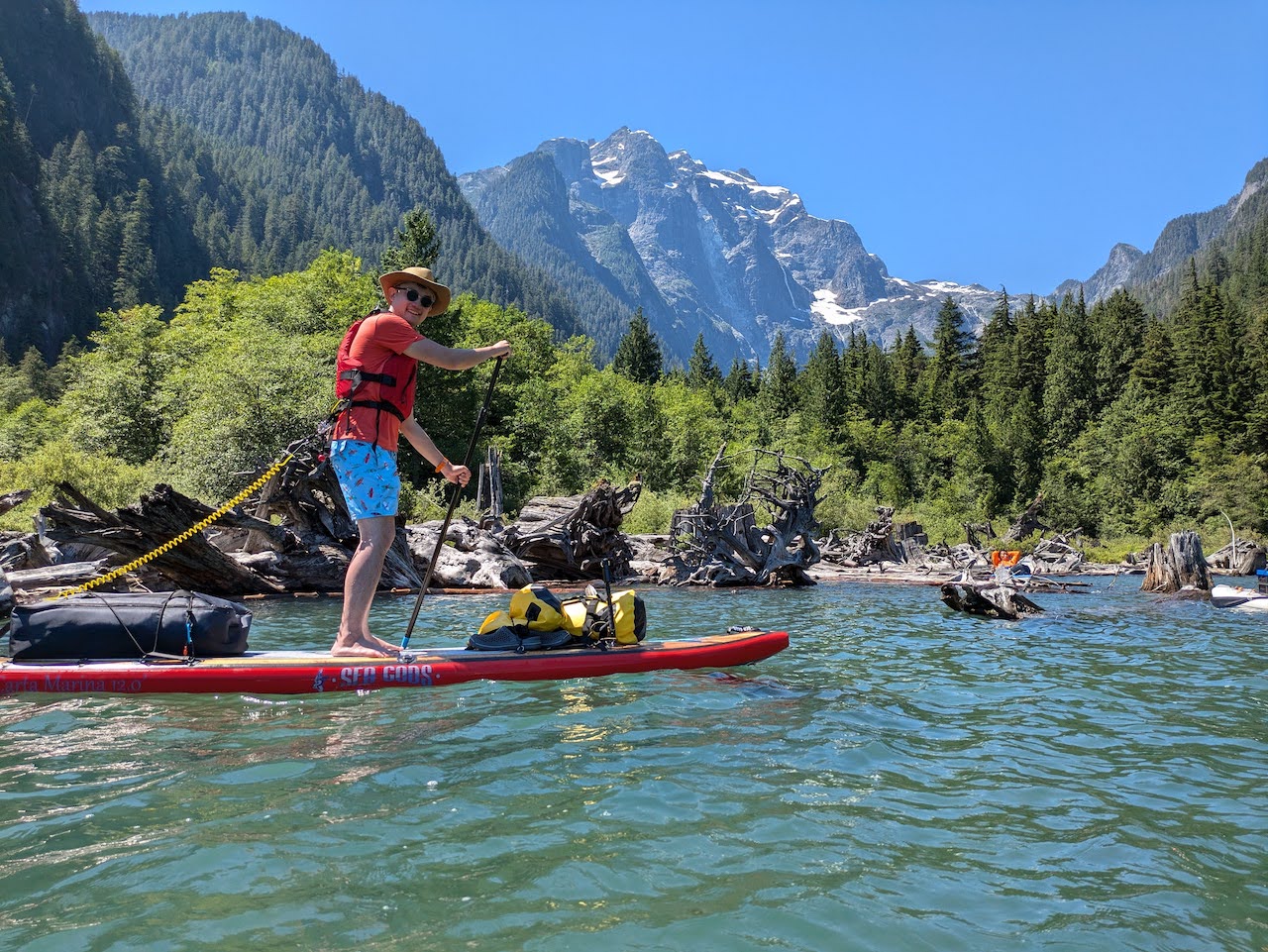 However, when Howard called for a paddle camping trip to a magical beach in the remote upper Stave Lake, right under the majestic glaciers of Mt. Robie Reid, I could not resist. He aptly described it as being similar to paddling to Granite Falls in terms of distance (approx. 18km depending on launch point), geography (long, narrow lake flanked by mountains), and thermal winds, but it ends with an epic view of glaciers. It’s even complete with its own power house.