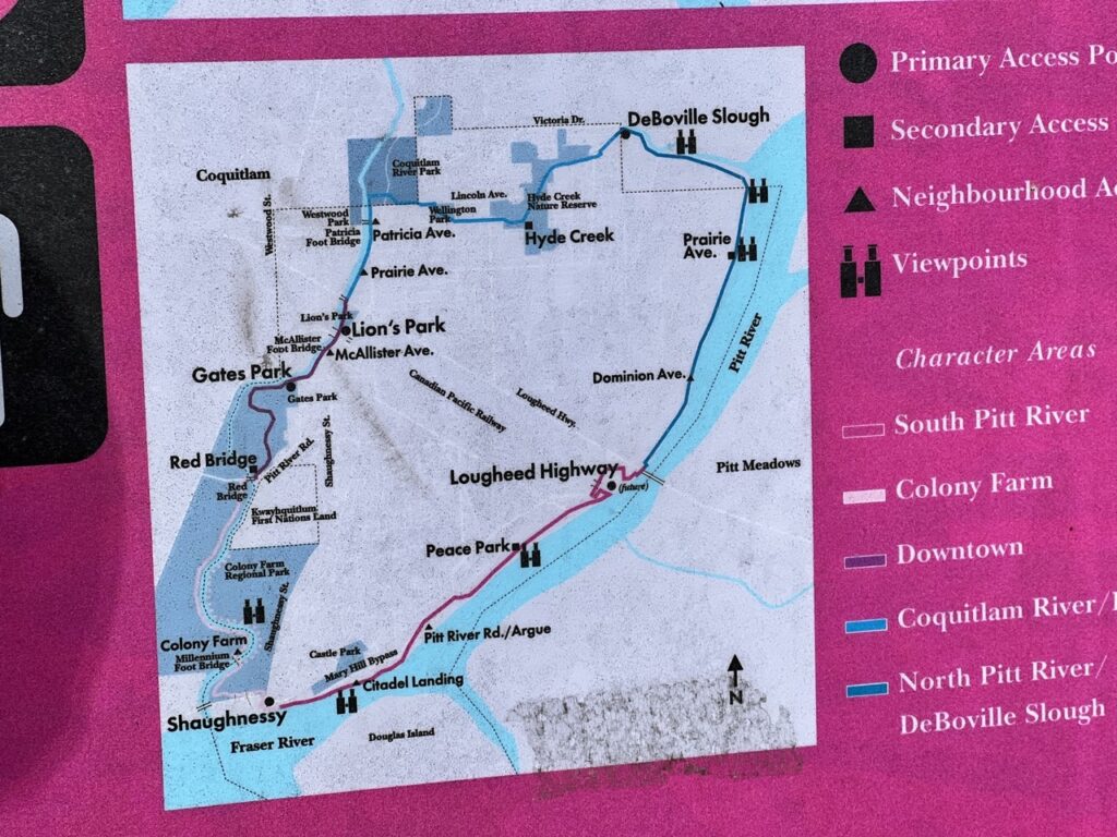 We went counter-clockwise. The trail was broken into 5 distinct sections, so we went in this order: South Pitt River, North Pitt River/DeBoville Slough, Hyde Creek/Coquitlam River, Downtown, and ƛ̓éxətəm (tla-hut-um) Regional Park.