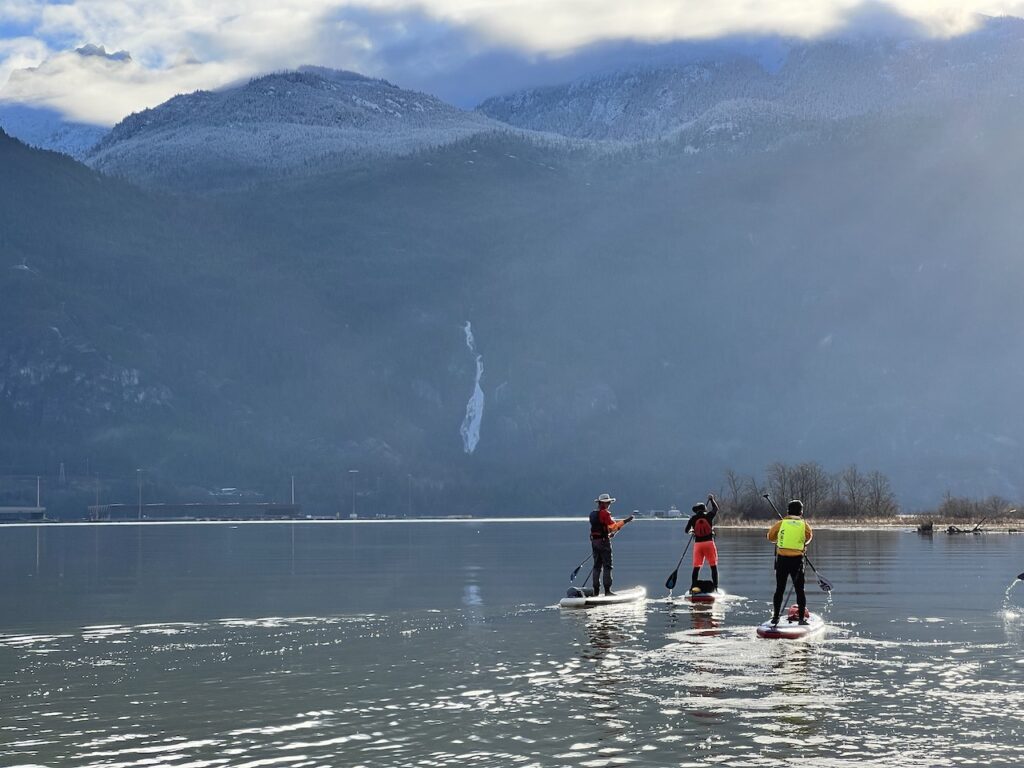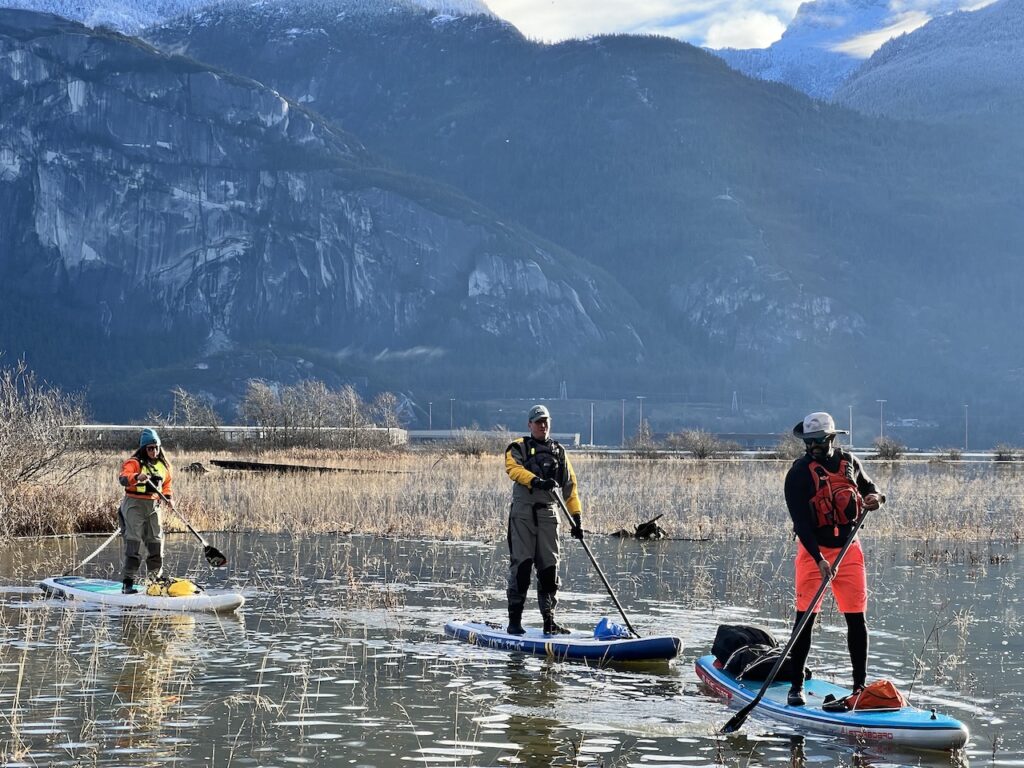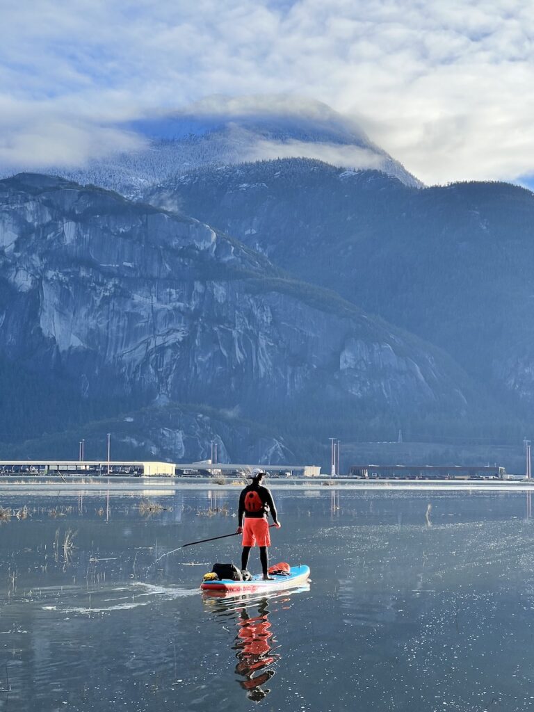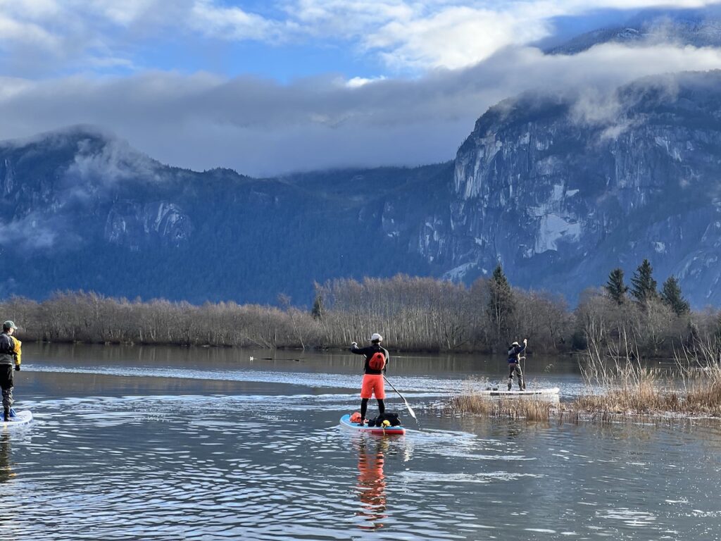 - Difficulty – Squamish is famous for its winds, which can significantly increase the difficulty. On rare days with minimal winds, it’s a low-intermediate paddle with gentle but noticeable current in the river. Look up the tide chart as well.