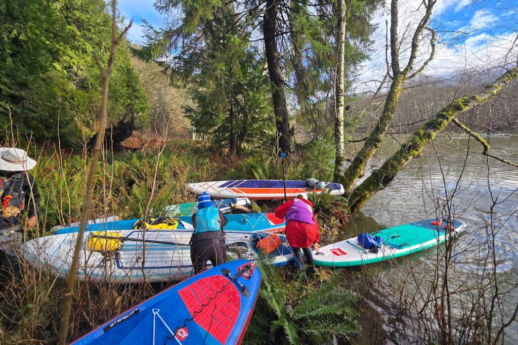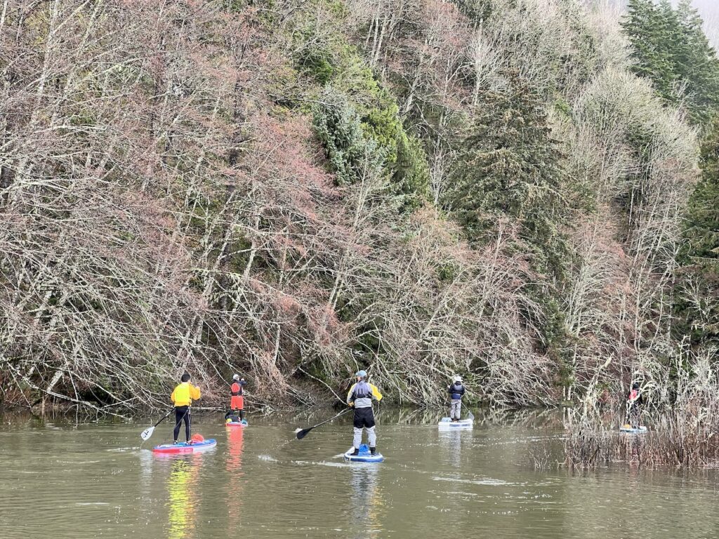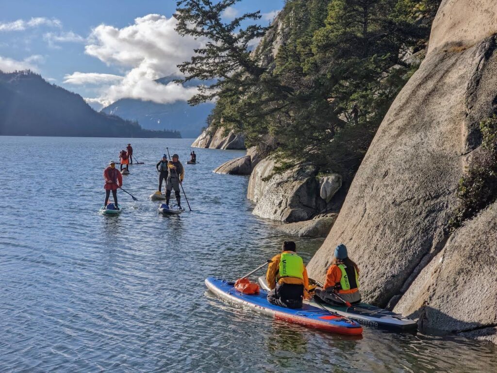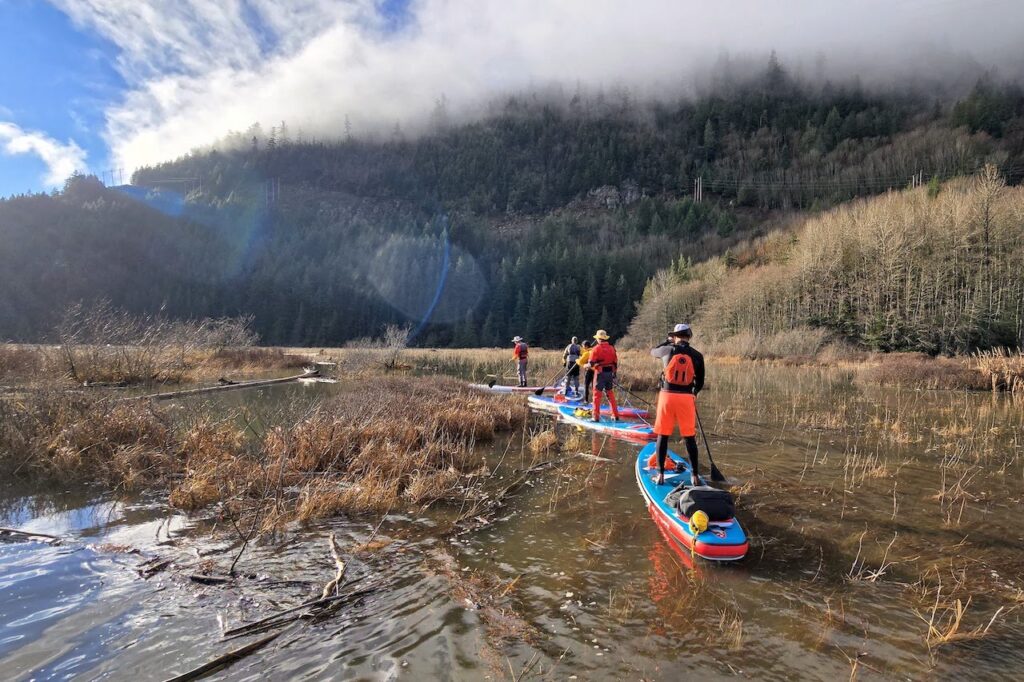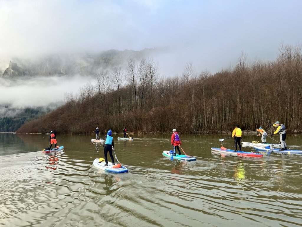 - Difficulty – Squamish is famous for its winds, which can significantly increase the difficulty. On rare days with minimal winds, it’s a low-intermediate paddle with gentle but noticeable current in the river. Look up the tide chart as well.