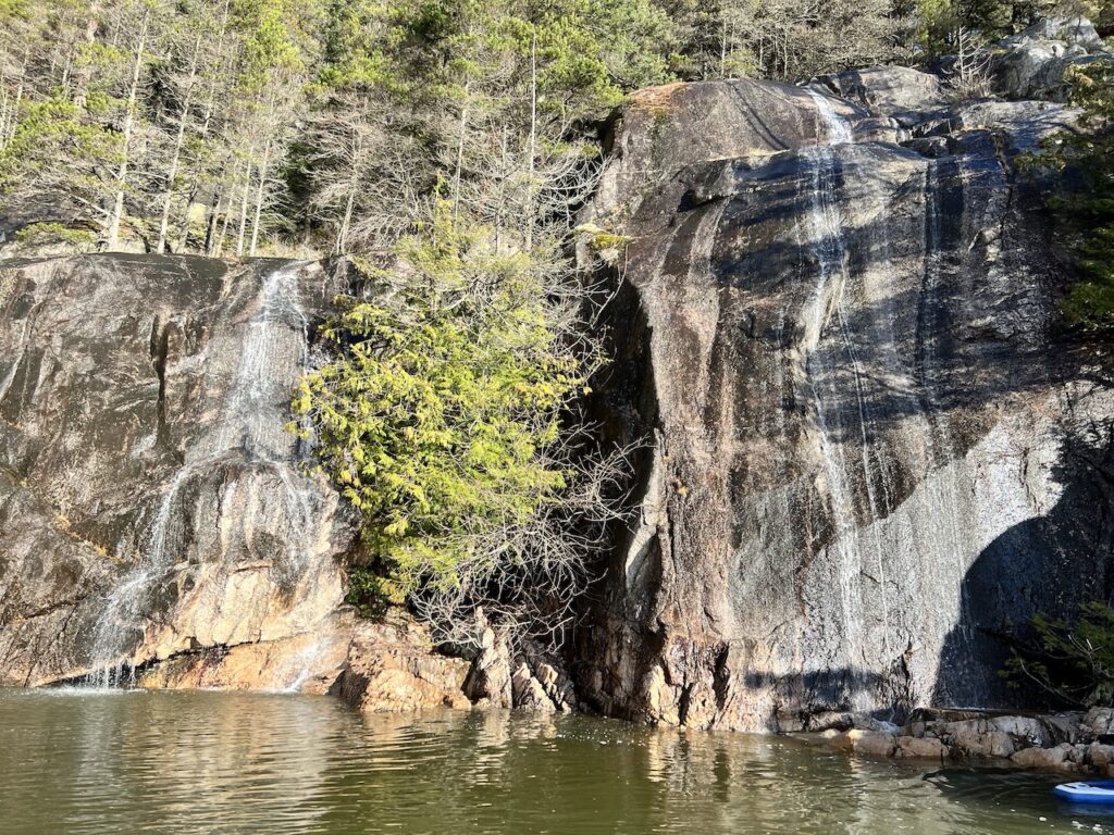 We left the estuary behind briefly and visited the cliff faces along Howe Sound. We found a nice spot to take a lunch break under a pair of waterfalls and shelter from the increasing northerly winds.