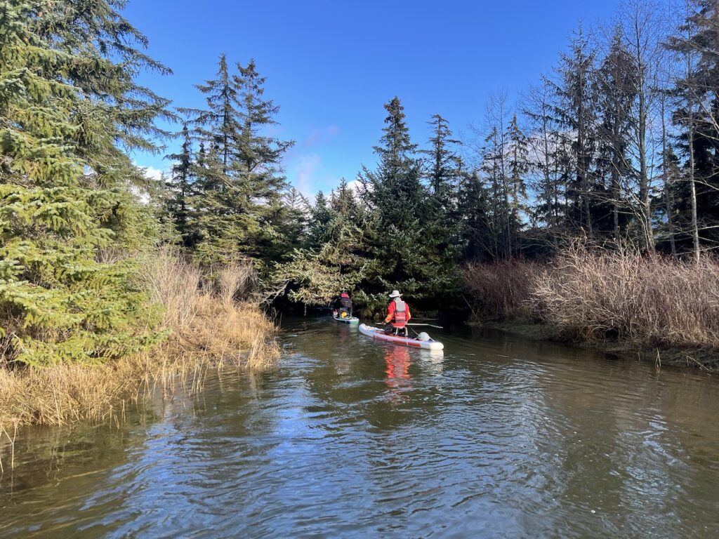 We crossed the mouth of the river and went inside the blind channel for a little more exploration. The narrow side channels reminded us of the River of Golden Dreams at Whistler, but frankly the views on the Squamish River were a lot better.