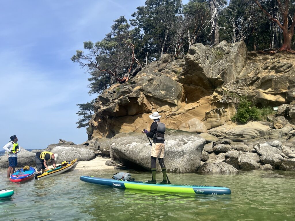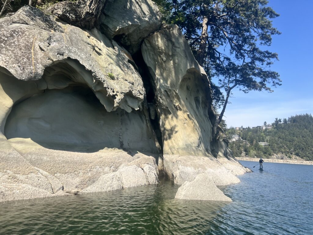 - View – beautiful open views of the ocean, dramatic sandstone formations reminescent of Gabriola Island, and pockets of shallow sandy beaches. It’s similar to paddling around Indian Arm or West Vancouver, but with noticeably less human development.