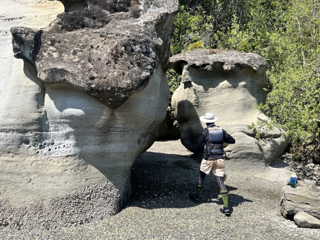Here, more dramatic sandstone formed pillars for a short exploration. However, it’s private property above the high tide line.