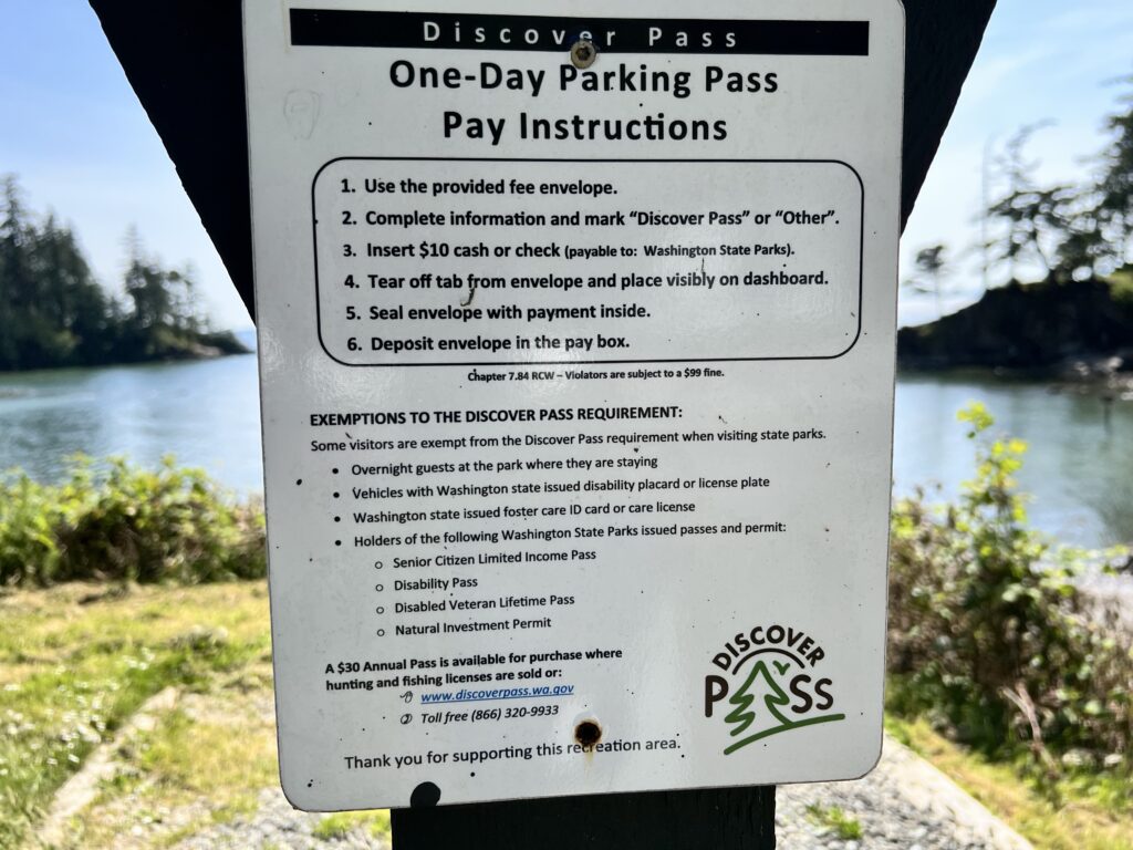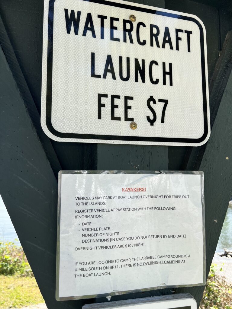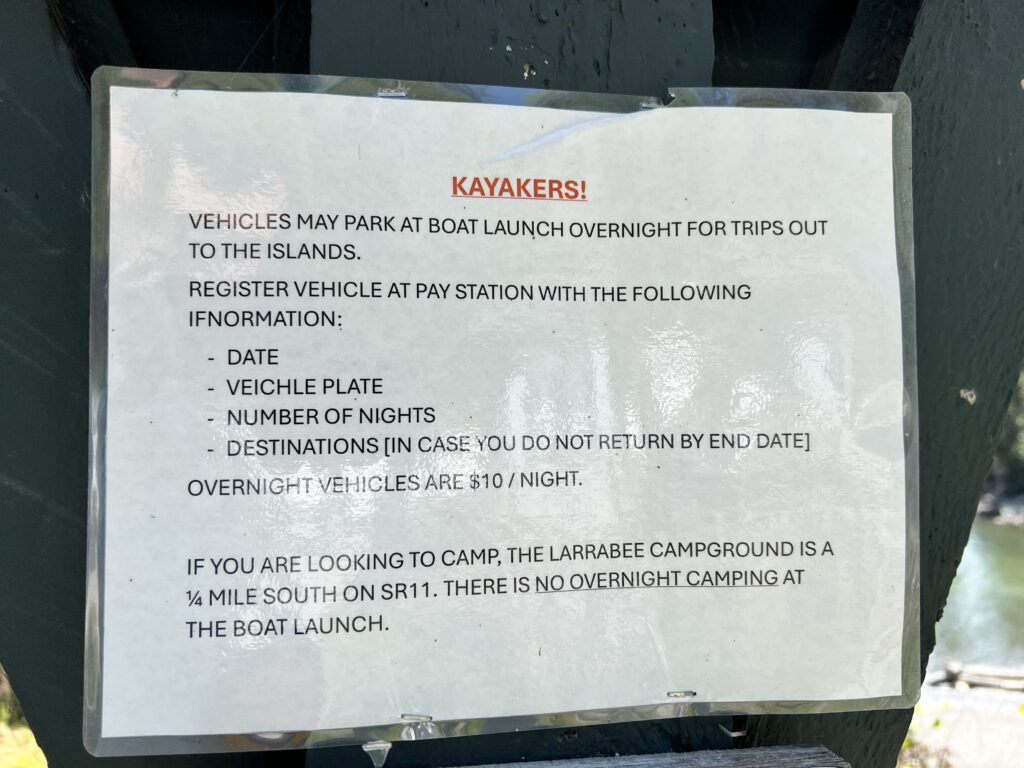 Parking at the boat launch would have cost $10, and each watercraft launch is an additional $7 USD. Bring exact change to place in an envelope and deposit box. This was quite steep and the odd sum of cash creates an additional hassle for those who don’t keep USD coins. We parked at a neighborhood gravel lot outside the park boundary instead. Campers at the Larrabee Campground do not have to pay extra for the parking but presumably watercraft launch is still $7.