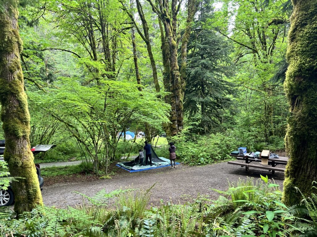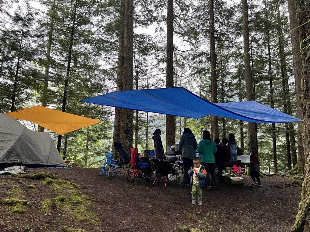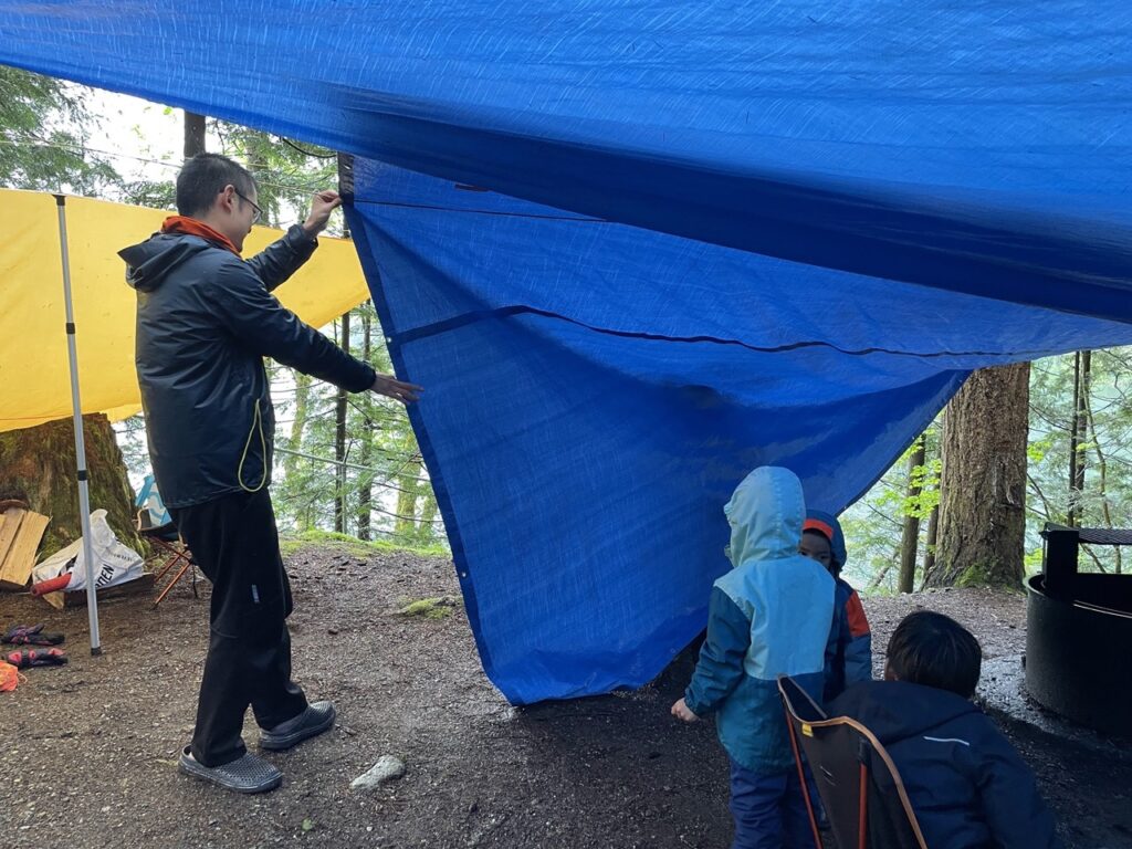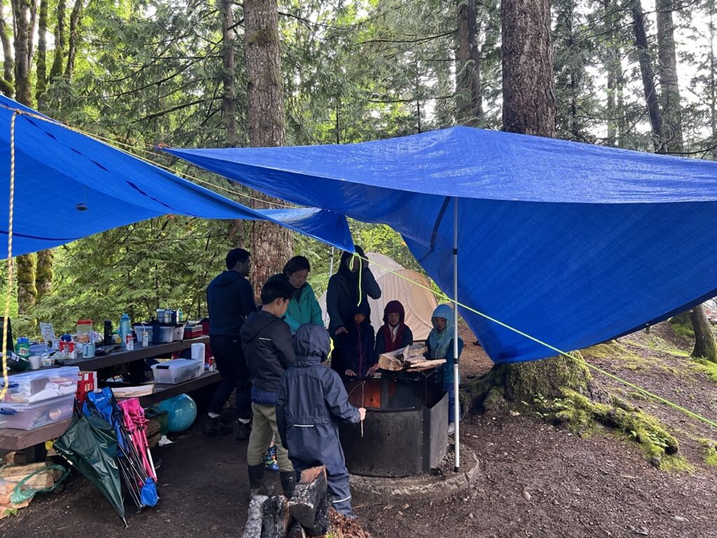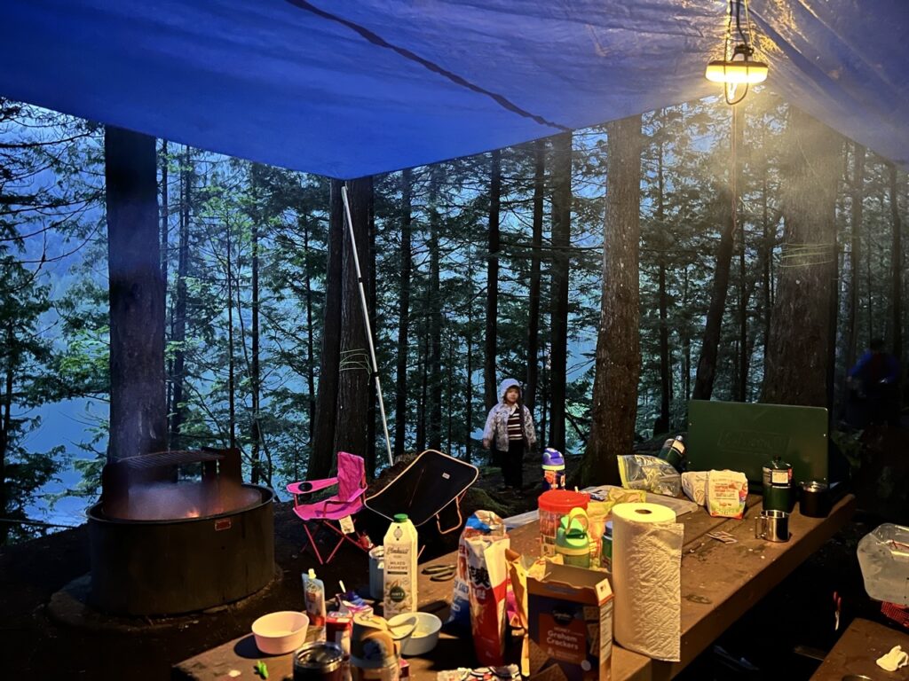 In preparation for rain, our first order of business was to put up our large rain tarp to cover our main activity area. With ample trees to choose from, it wasn’t hard to pick the perfect anchors to cover the entire picnic table and the surrounding few feet of space.