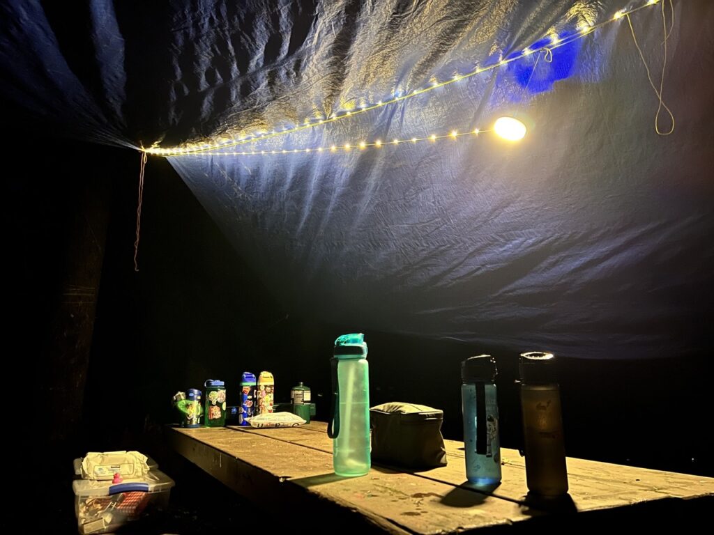 This time, I put a string light on the central ridge line under the main tarp for extra ambience and illumination, and it really shined. I think this will be our new rainy set up going forward.