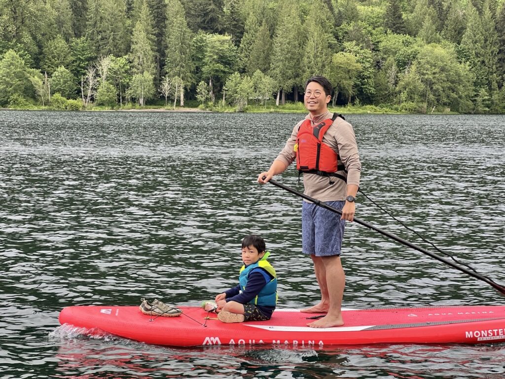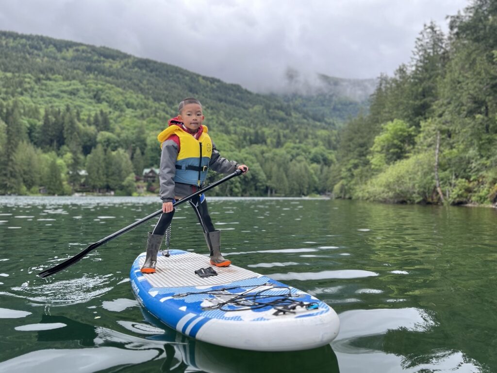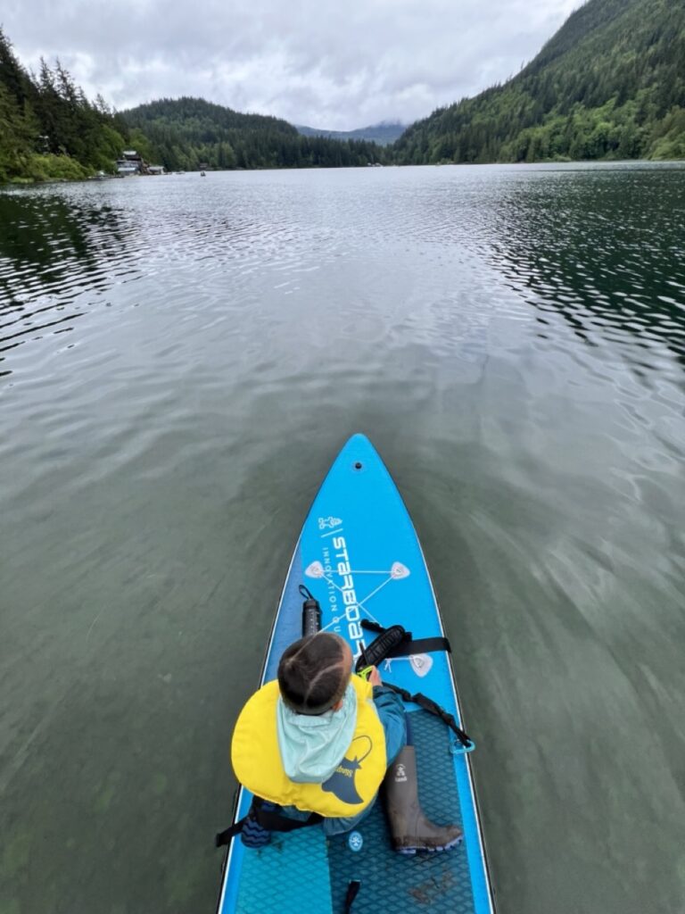 With a few sunny breaks, we snuck in some quick paddles around the lake. The kids enjoyed paddleboarding as expected, and Big Bro picked up where he left off last season, standing and paddling his board comfortably right away.