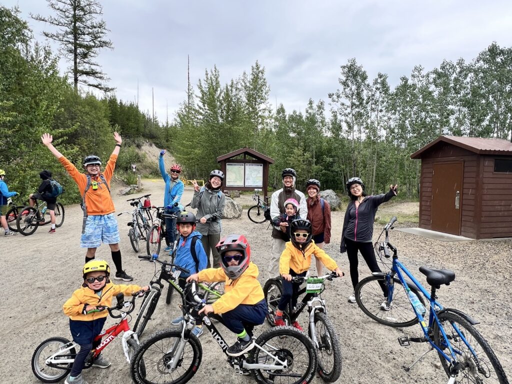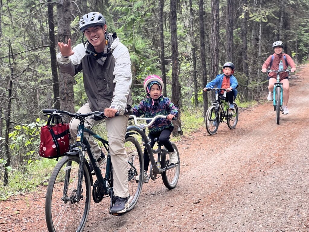 Given the very large group of 6 families biking together, we set off at different times. Our two older boys are expert riders who would have no trouble riding the flat 22km, but Baby Bro just started pedaling a few months ago. Our plan was to have Grandpa and I lead the two older boys to complete the trail ASAP, turn back to meet Tina and Baby Bro, then Tina can bike more with me while Grandpa stays with the boys.