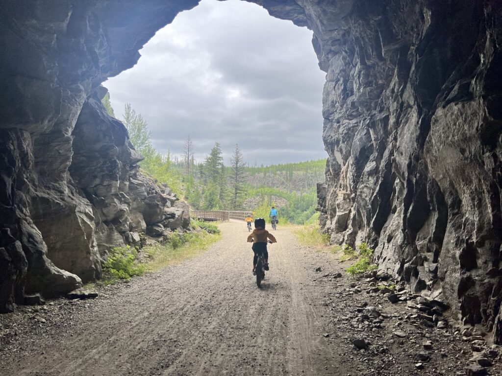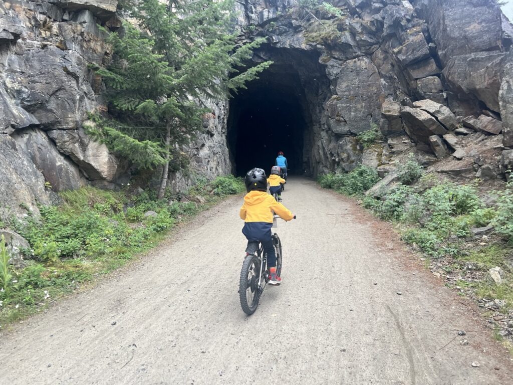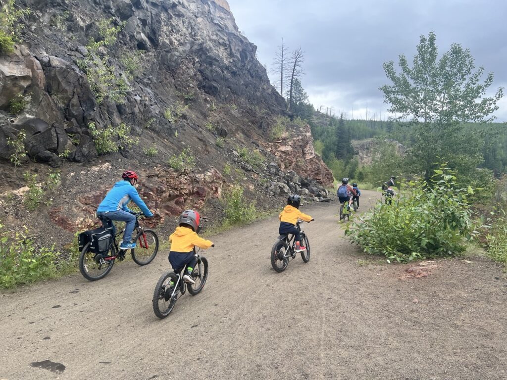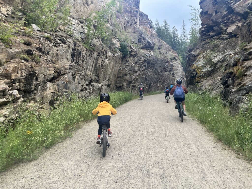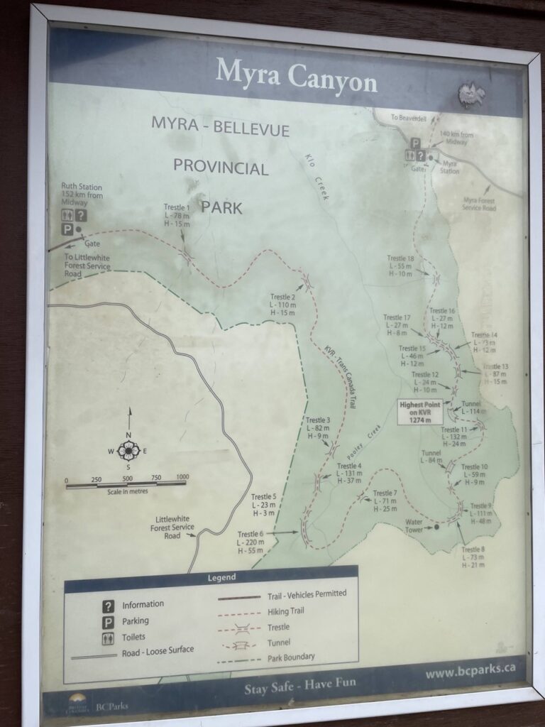 Some of our group needed to rent bikes from Myra Canyon Bicycle Rental, so we set our starting point at Myra Station. The parking lot here is much bigger than Ruth Station and it’s well laid out with new gravel. The 9km of Myra Forest Services Road to access this trailhead was littered with small potholes, but nothing too daunting for even a city car. We had no trouble with a fully loaded minivan with a bike rack.